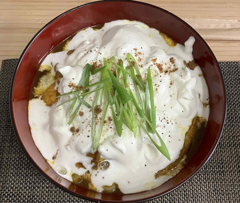 「カレーうどんは、今までに見たことのないインパクトのあるビジュアルで、白いクリーミーなベールの下からは、スパイスの香りが漂ってきます。食べてみるとスープが混ぜ合わさって、まさに日本、インド、フレンチの三位一体、これぞ味のジェットストリームアタック!